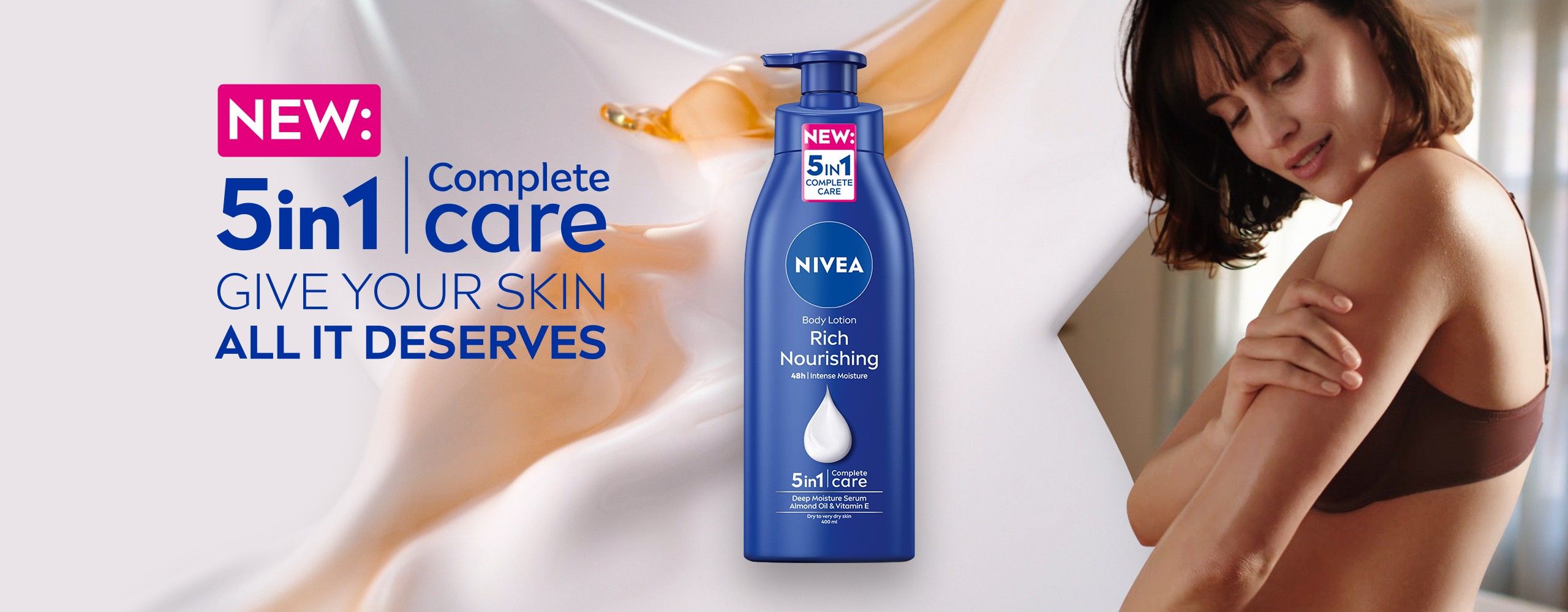 Your skin grows with you, through life's highs and lows. Take the time to give your skin the care it deserves with NIVEA Rich Nourishing Body Lotion. The New: 5in1 Complete Care provides 48 hours of deep moisture, with nourishing almond oil.