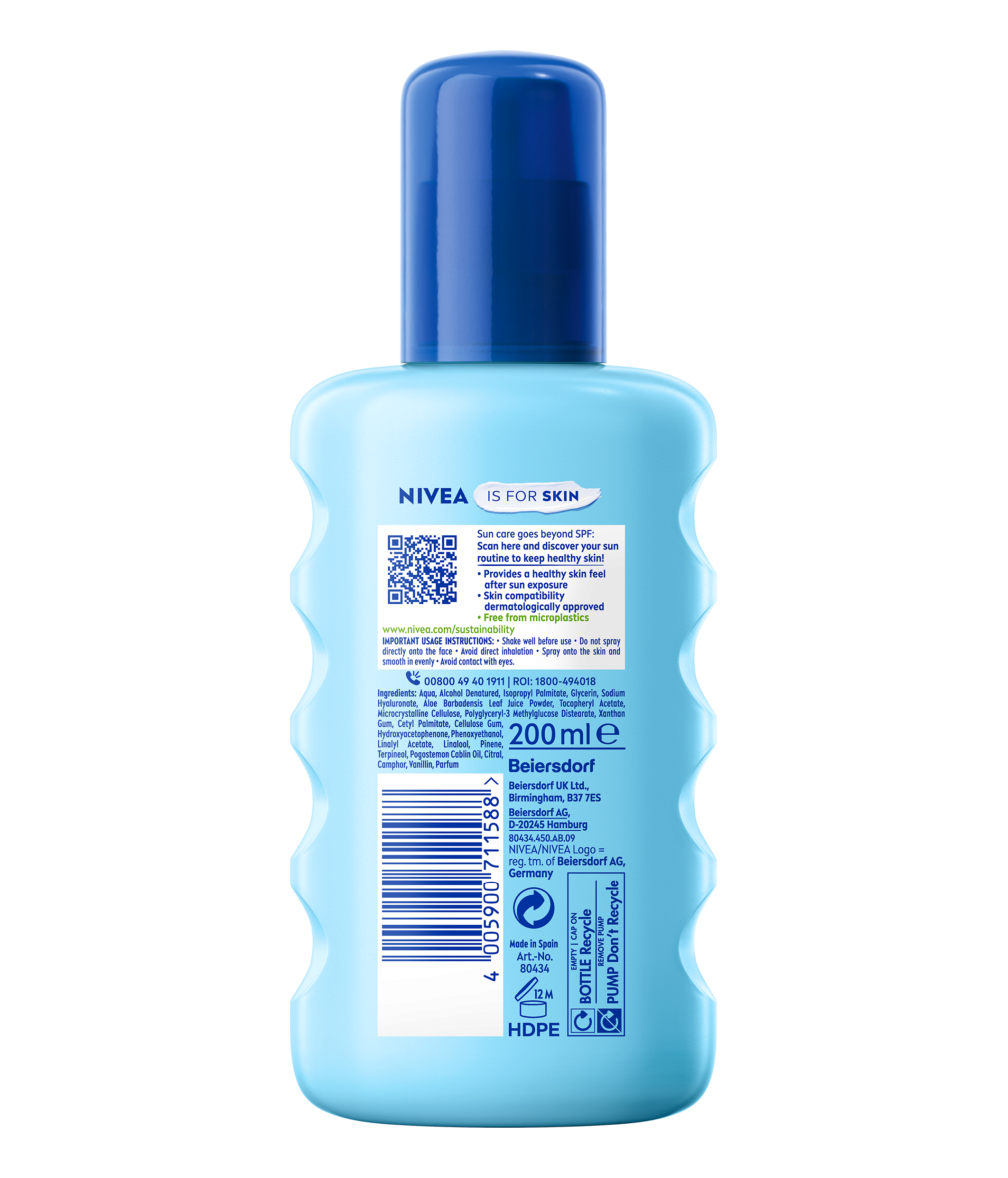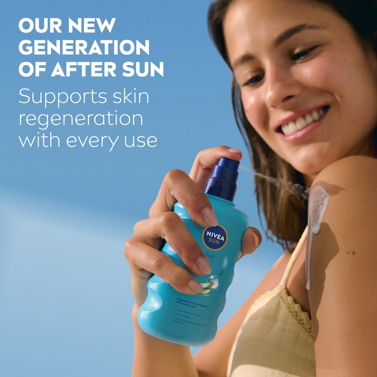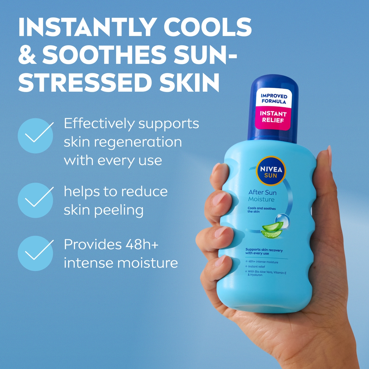 Provides instant relief, soothes and supports the regeneration of sun-stressed skin – for 48h+ moisture, reduced skin peeling, and a revitalised skin feel: NIVEA SUN After Sun Moisture Spray.