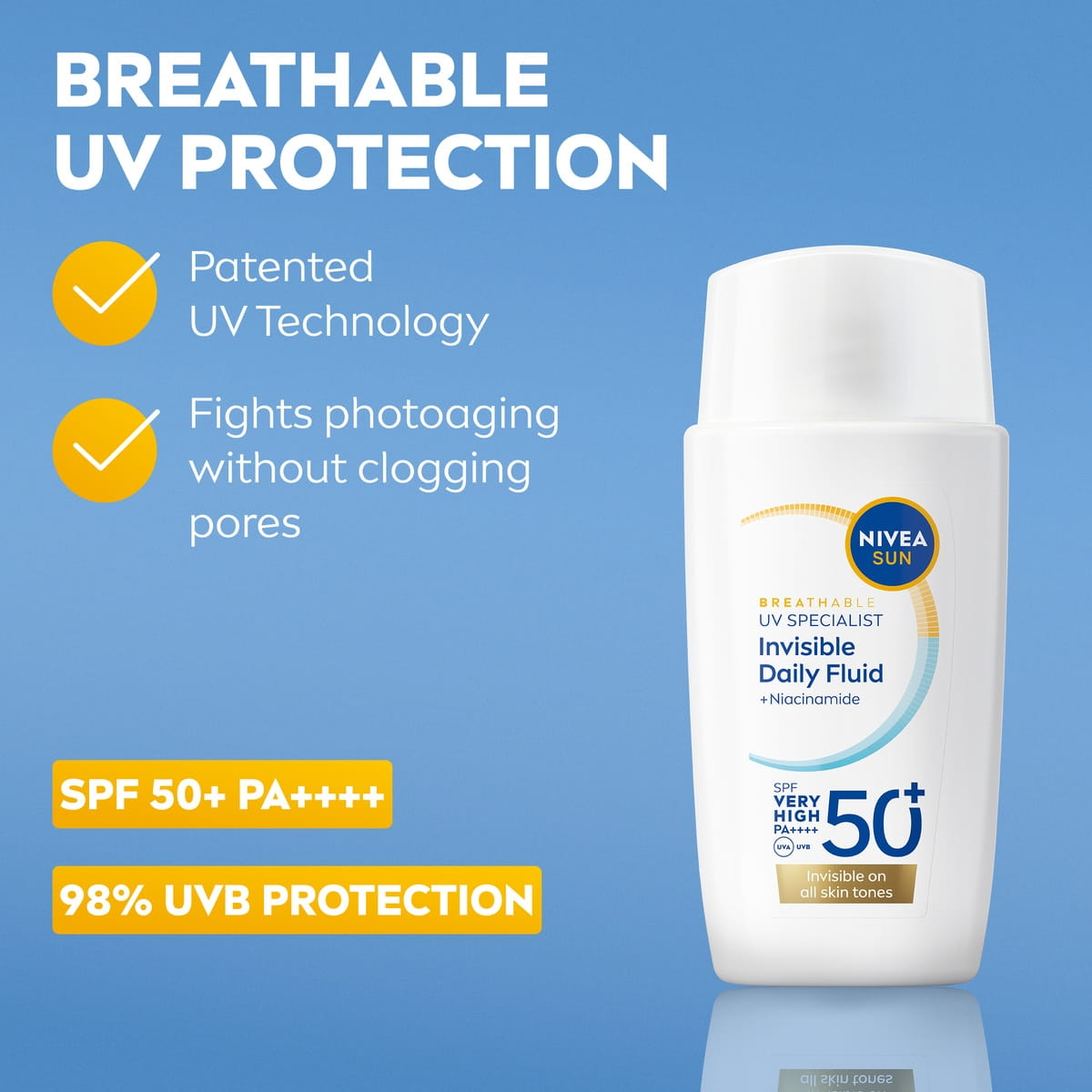 NIVEA SUN Breathable UV Specialist Invisible Daily Fluid SPF 50+ fights photoaging without clogging pores. Invisible on all skin tones. Absorbs immediately with no white residues.