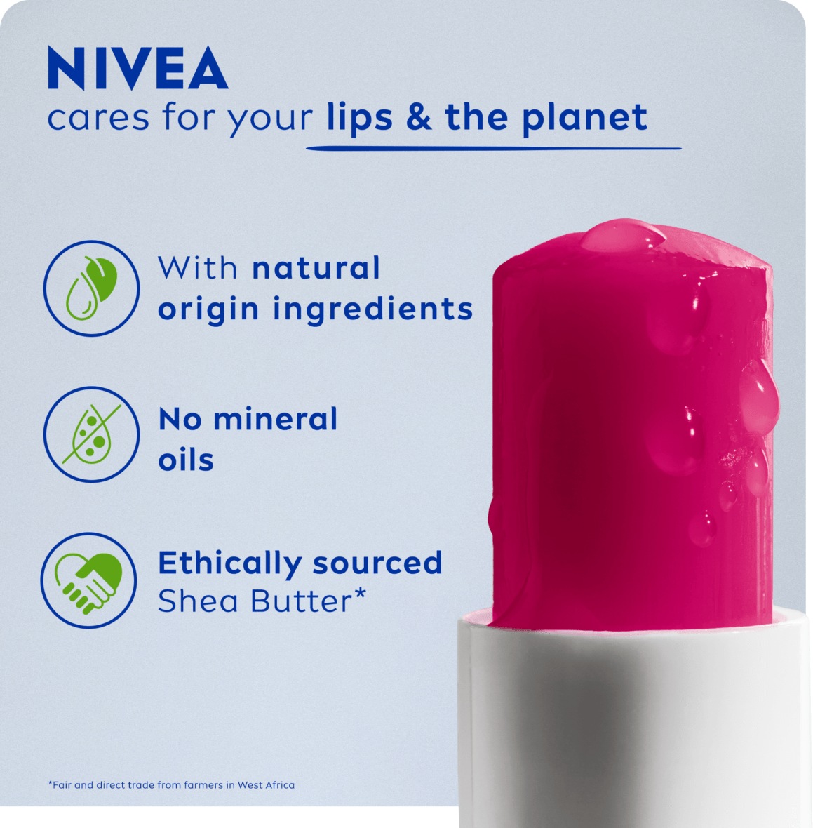 Pamper your lips with a wonderfully delicious cherry aroma and a ruby red tinted shine of NIVEA Cherry Shine Lip Balm. The formula melts into your lips, leaving them moisturised for 24 hours. Vegan formula.