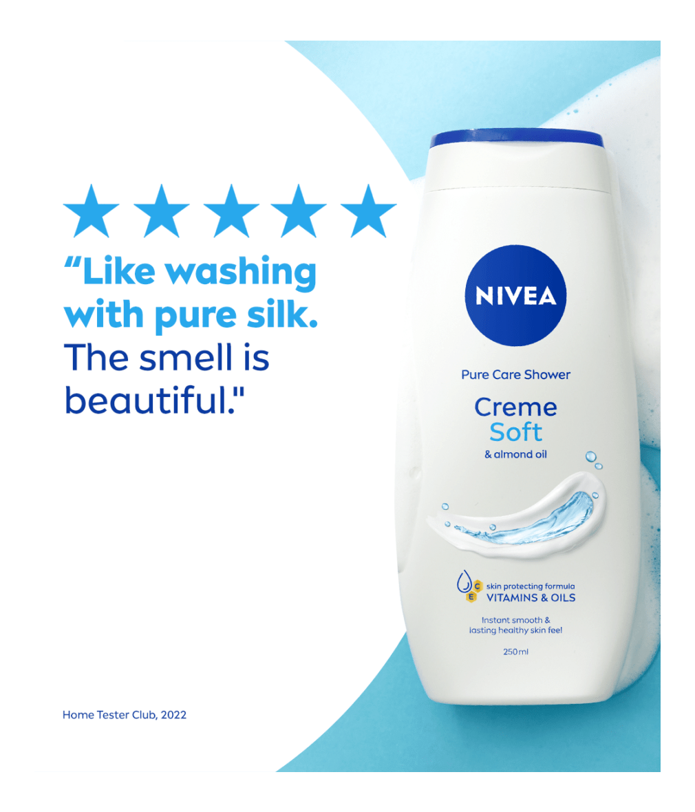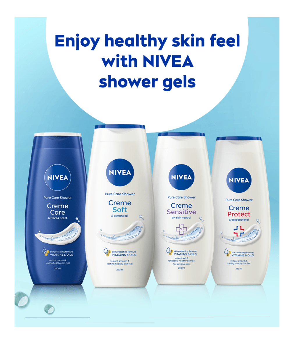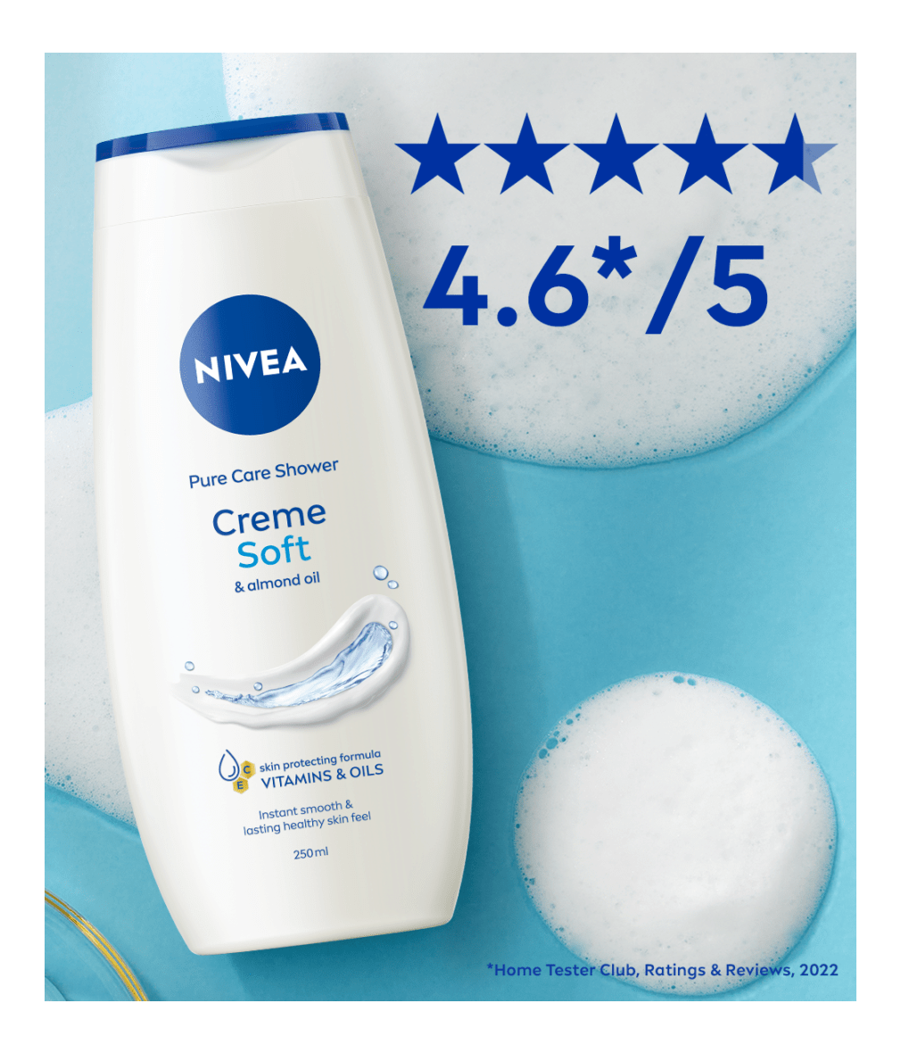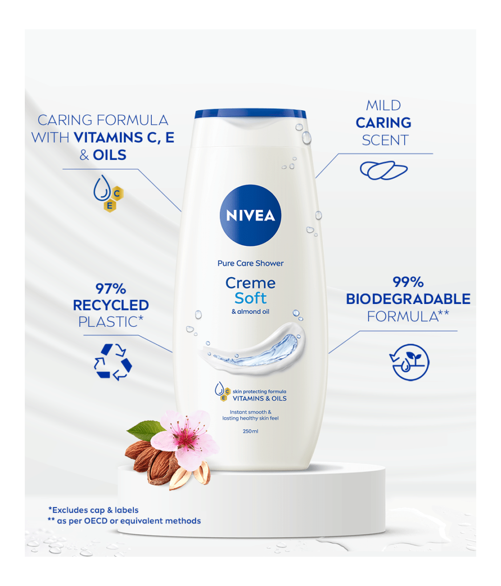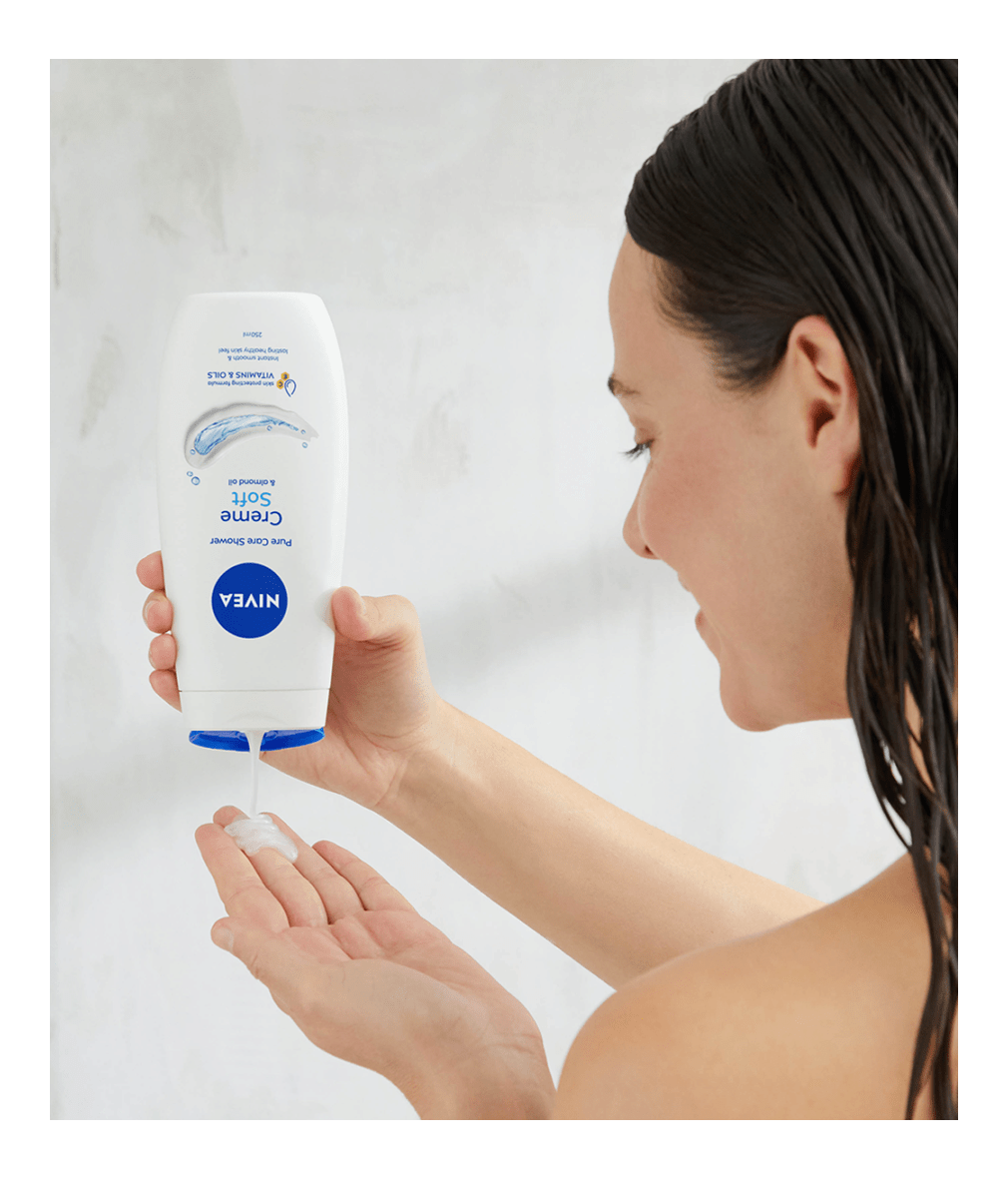 Caring shower gel that leaves you with a soft and healthy skin feel. Enriched with vitamins C & E, precious oils and almond oil, this body wash gently cleanses and protects the skin: NIVEA Creme Soft shower gel.