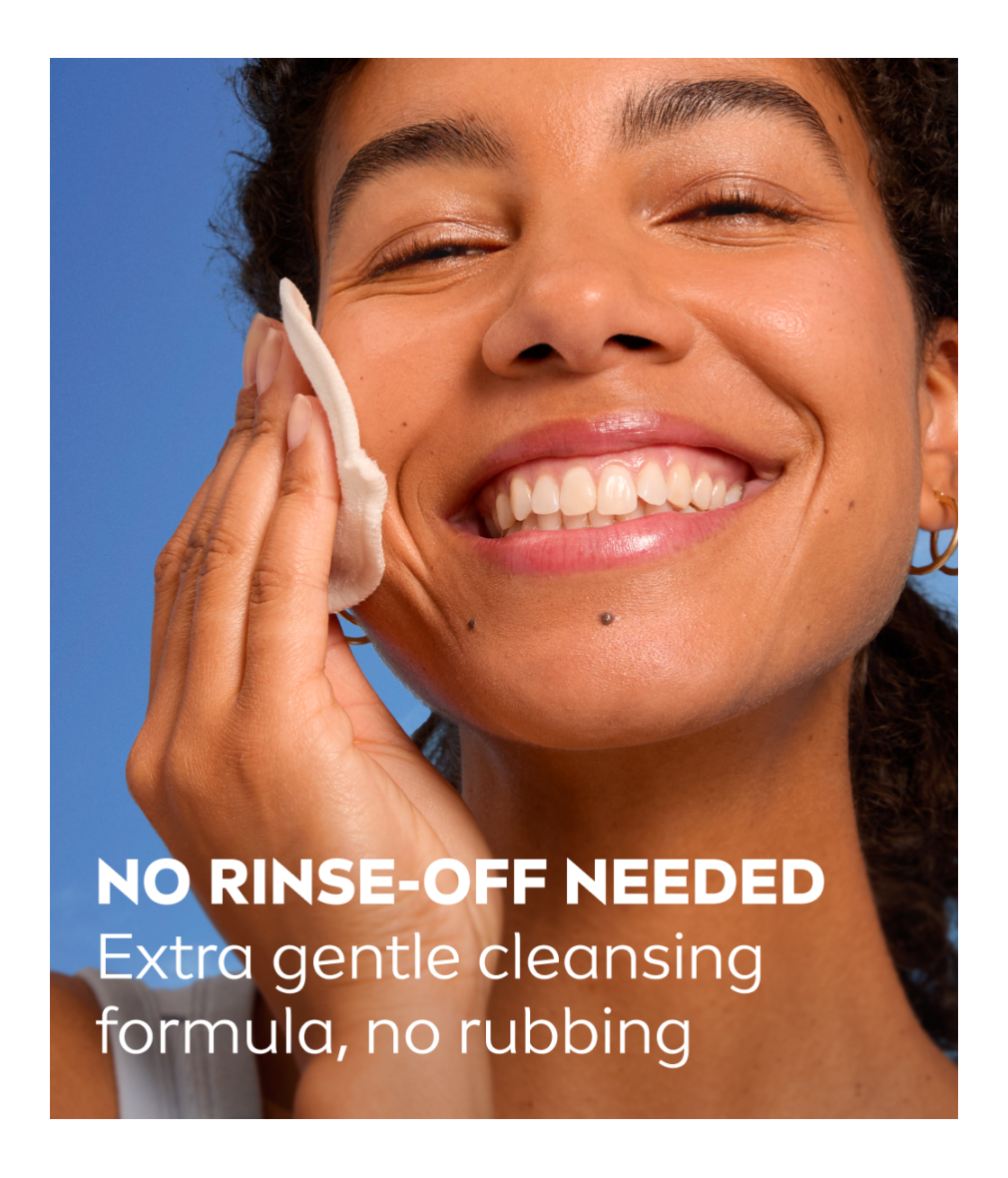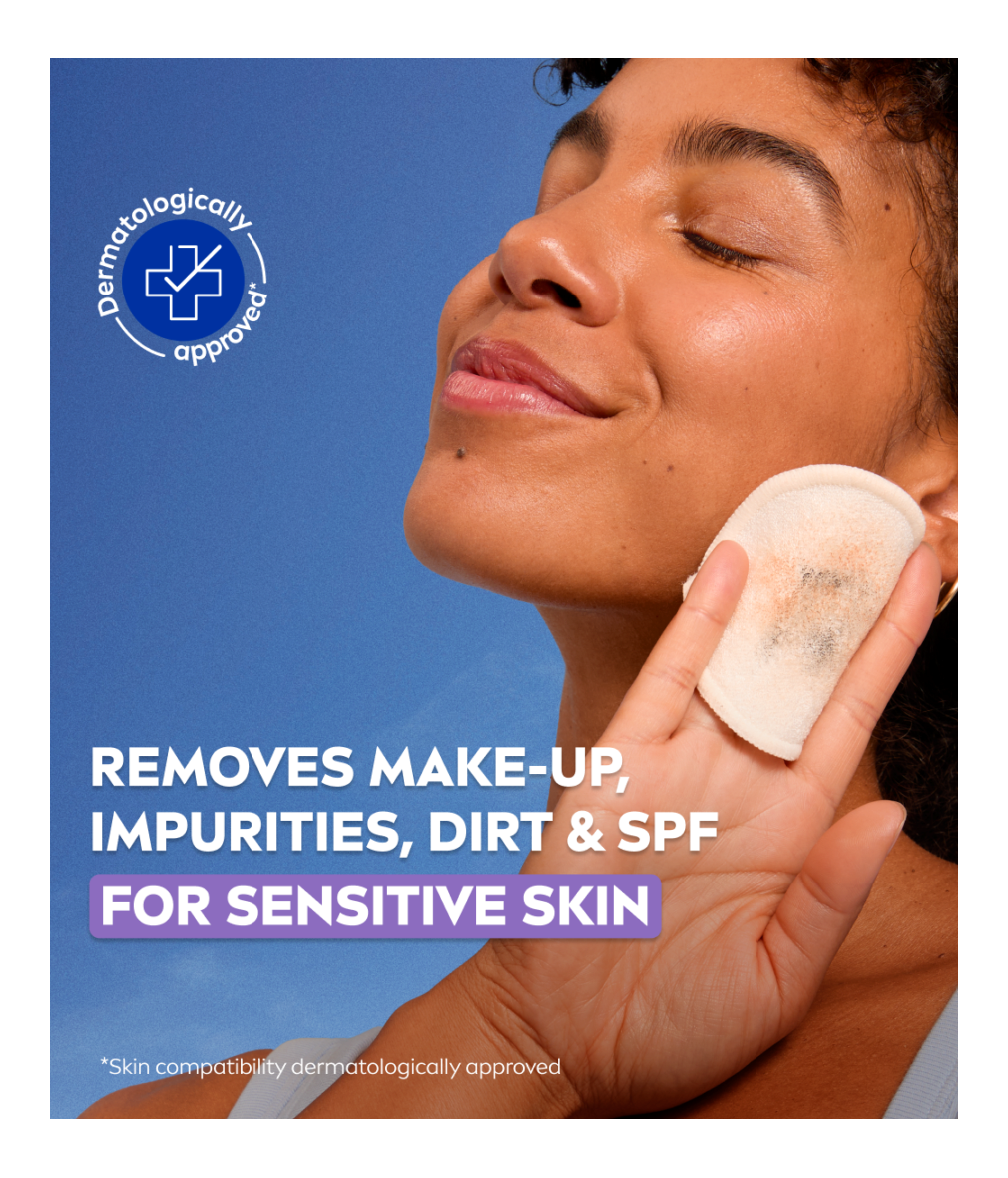 Gently wipe over your face and closed eyes to dissolve make-up and mascara