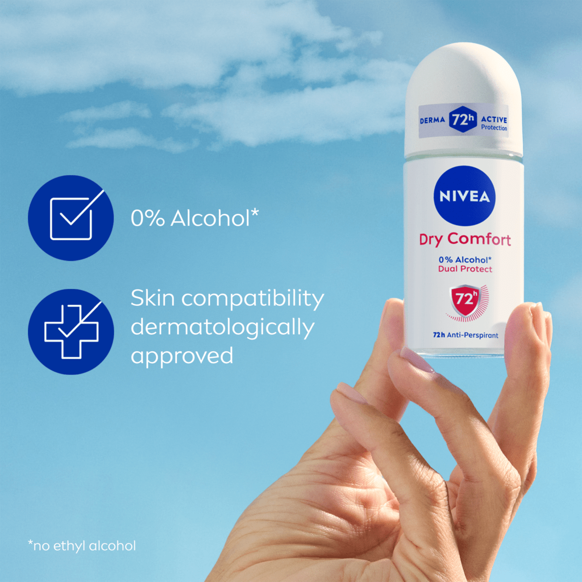 NIVEA Dry Comfort Anti-Perspirant ensures reliable 72h anti-perspirant protection that cares for your skin, all with 0% Ethyl alcohol. The formulas are skin tolerance dermatologically proven. Our anti-perspirants offer Derma 72H Active protection.