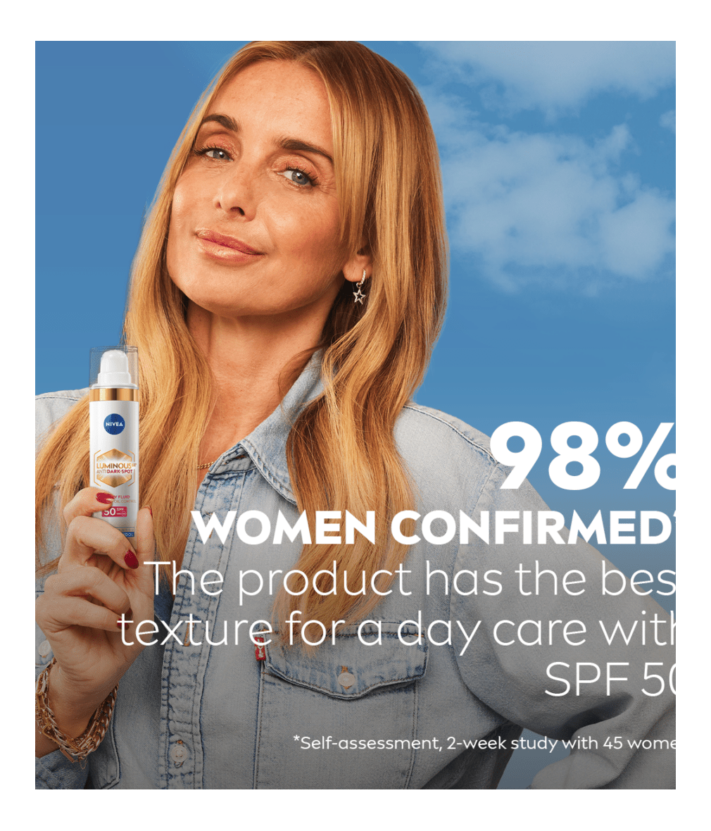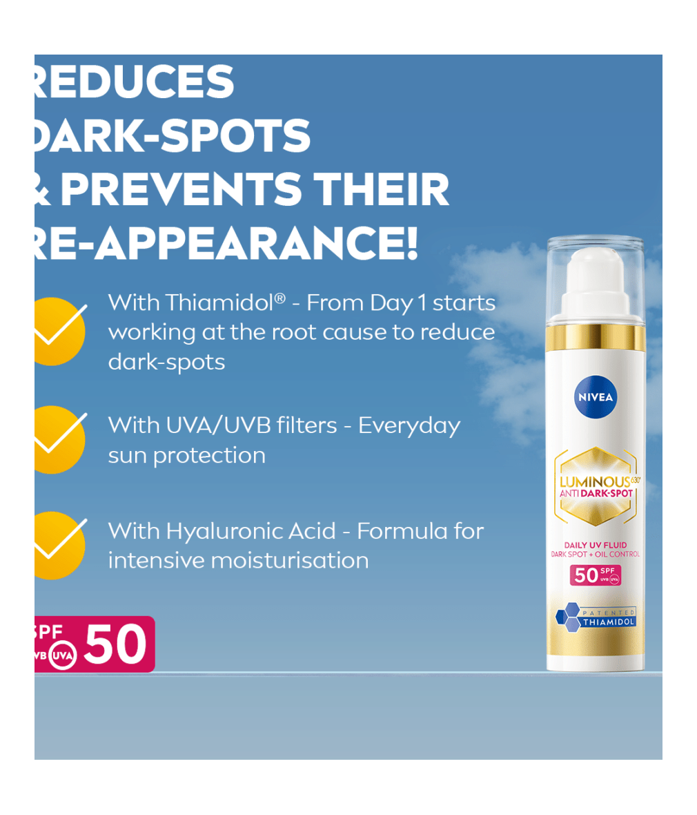 LUMINOUS630® Anti Dark-Spot Daily UV Fluid SPF50 with patented Thiamidol® reduces dark spots visibly after 2 weeks.