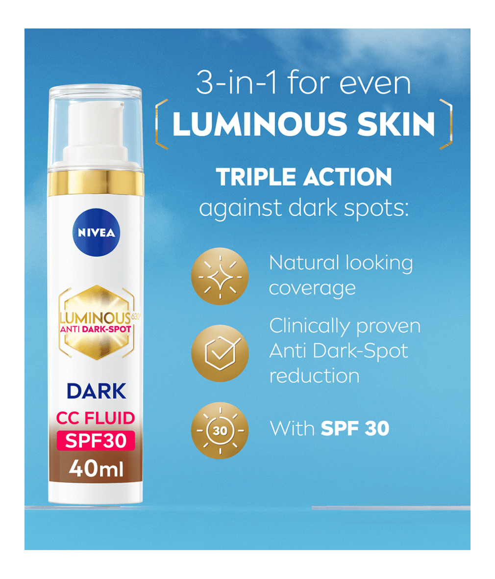 The Luminous630 CC Fluid covers, reduces and protects from dark spots - visible results in 2 weeks. With skin tone adapting pigments. For an even, brighter, luminous skin.