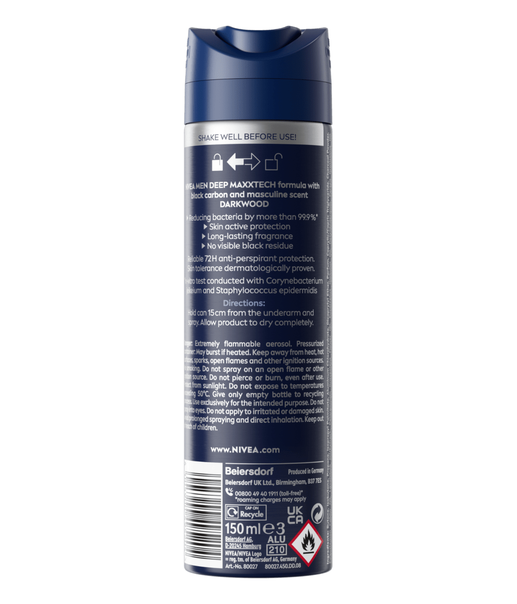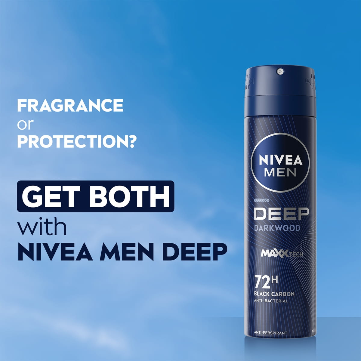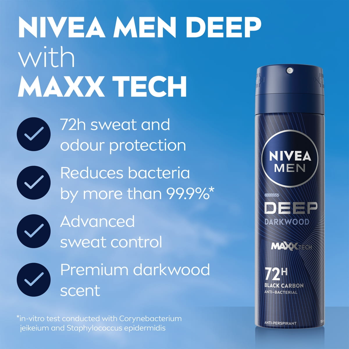 NIVEA Men Deep 150ml Antiperspirant spray MAXXTECH formula with black carbon and masculine scent DARKWOOD