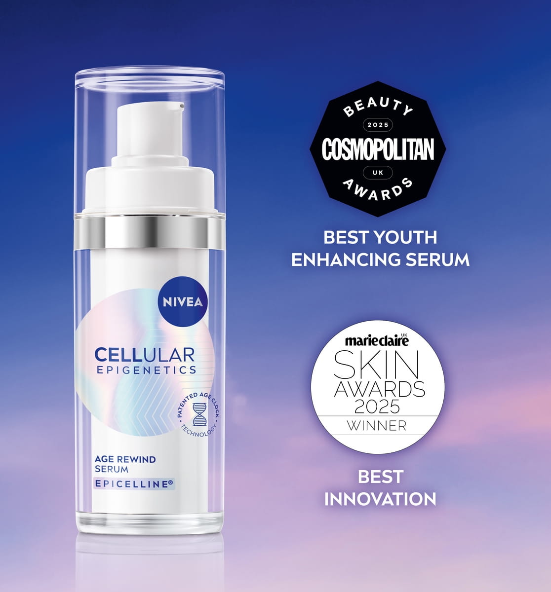 NIVEA CELLULAR Epigenetics Age Rewind Serum, with its patented Age Clock Technology® and breakthrough ingredient Epicelline®, rewinds skin age in 2 weeks.*