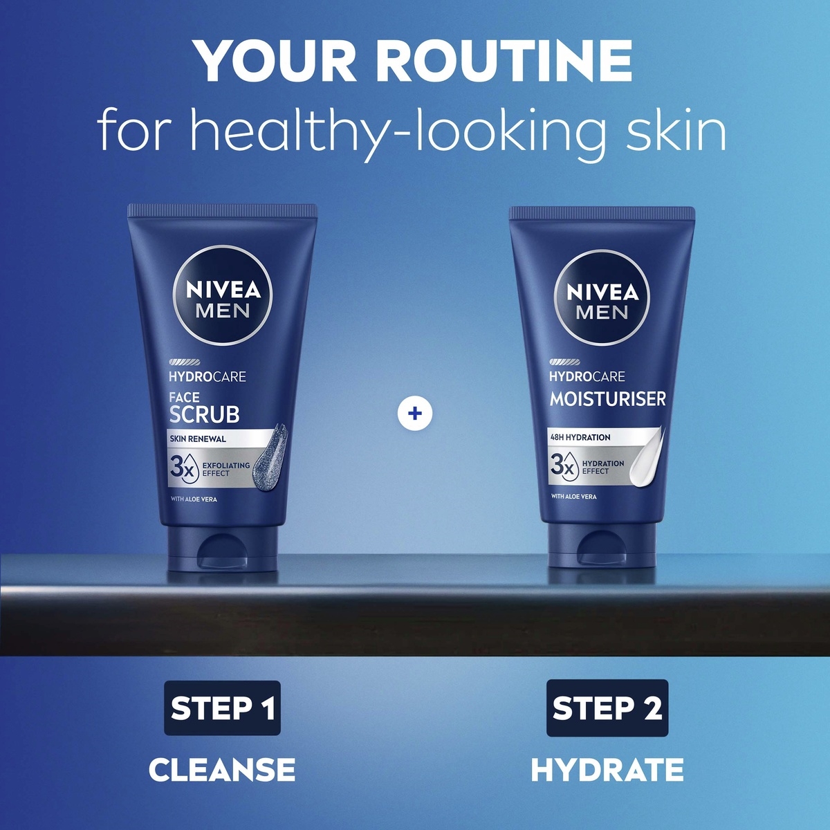 NIVEA MEN® Hydrocare Face Scrub deeply cleanses your skin to unclog pores and remove impurities and excess oil. The caring formula with Aloe Vera and Pro-Vitamin B5 contains fine exfoliating particles that lift away dead skin cells, refining and smoothing your skin’s appearance. It helps protect your skin’s natural barrier, leaving it refreshed, energised, and cared for after every use. Dermatologically approved for skin compatibility, this scrub is ideal for men on the go and comes in a practical travel size. Make NIVEA MEN® Hydrocare Face Scrub part of your routine for clean, healthy-looking skin that feels revitalised every day.