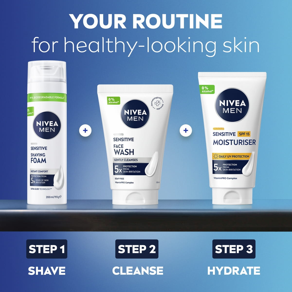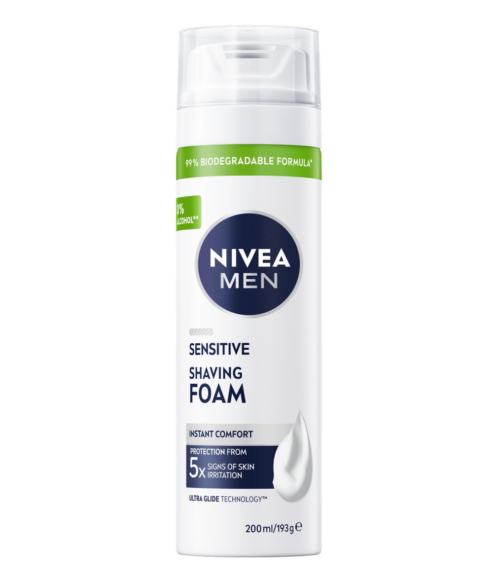 NIVEA Men Sensitive Shaving Foam This shaving foam has been designed with your sensitive skin in mind. The product softens your beard hair with Ultra Glide Technology – for a close and ultimately smooth shave without skin irritations like burning.