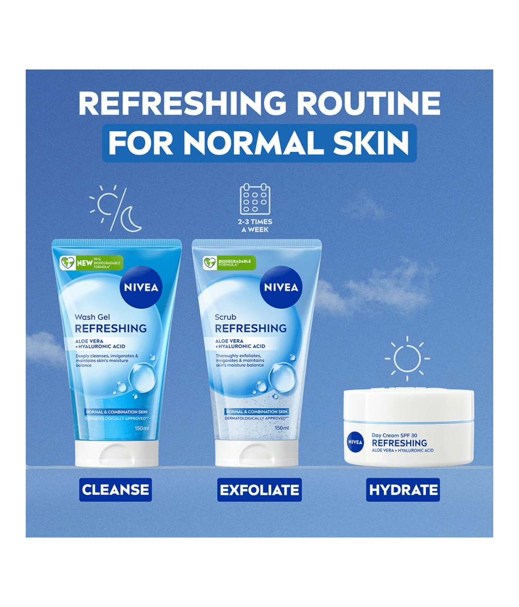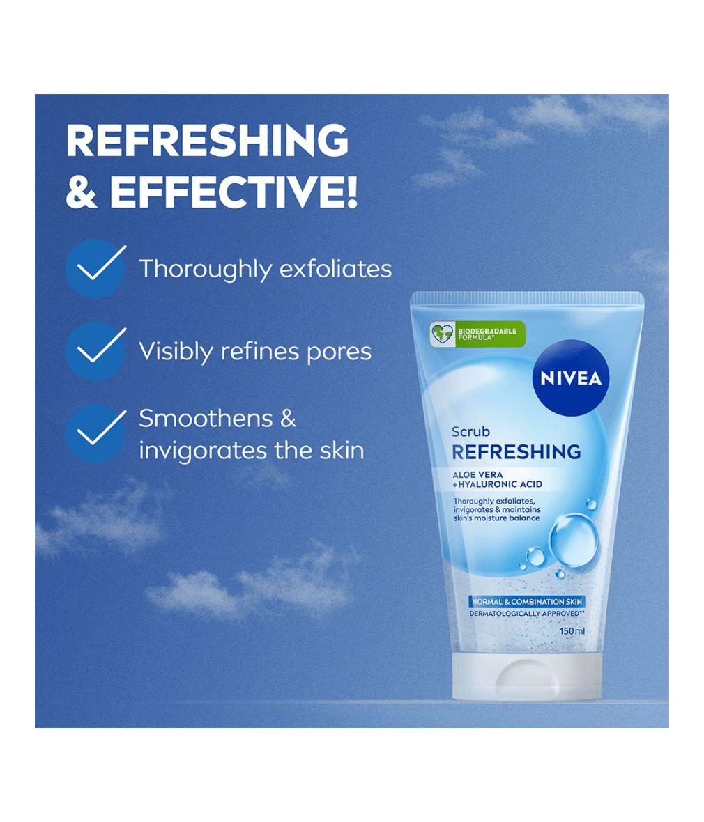 Enjoy a refreshing and invigorating cleansing experience with NIVEA Refreshing Face Scrub. Thoroughly scrubs away impurities while caring for your skin. This effective yet gentle formula deeply exfoliates the skin, removing impurities and excess sebum while caring for your complexion. Fine exfoliating particles help to unclog pores, leaving skin feeling noticeably soft, smooth, and refreshed after every use. With regular application, the scrub helps refine skin texture and reduce the visible appearance of pores. Its refreshing fragrance awakens the senses, transforming daily cleansing into a revitalising ritual. Trust NIVEA’s skincare expertise for a clean, balanced, and beautifully refreshed complexion that feels healthy and renewed.