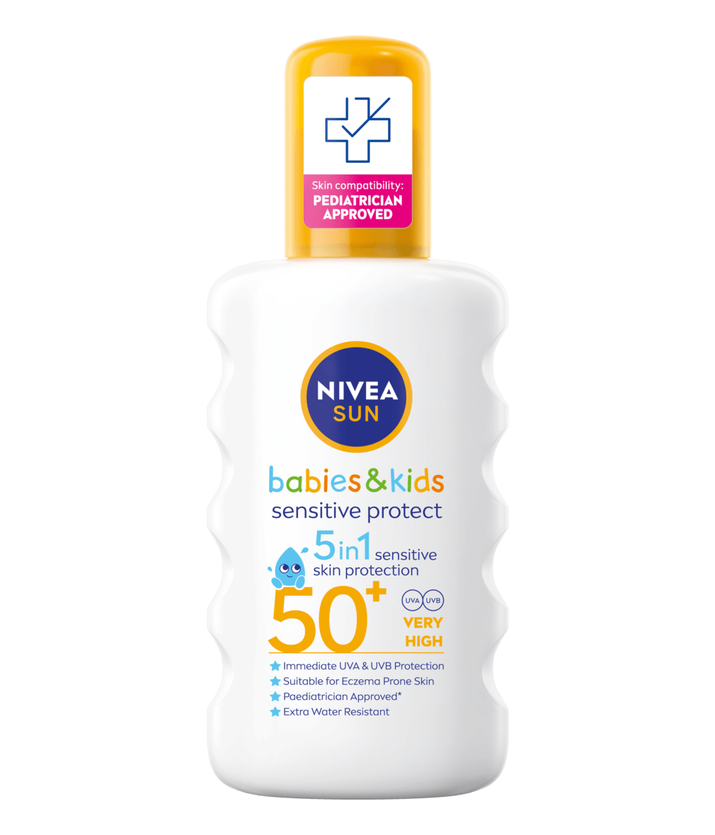 The 5in1 sun protection for Babies & Kids sensitive skin. Extra water resistant, immediate protection from UVA/UVB rays. NIVEA SUN Babies & Kids Sensitive Protect Spray.