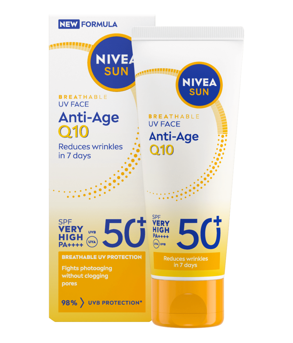 NIVEA SUN Breathable UV Face Anti-Age Q10 SPF 50+ fights photoaging without clogging pores. Reduces wrinkles and firms skin in 7 days.