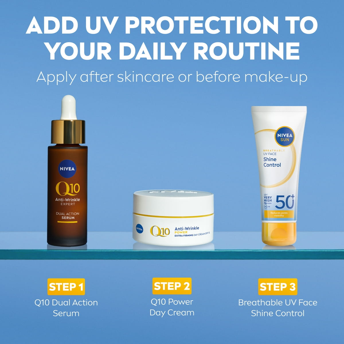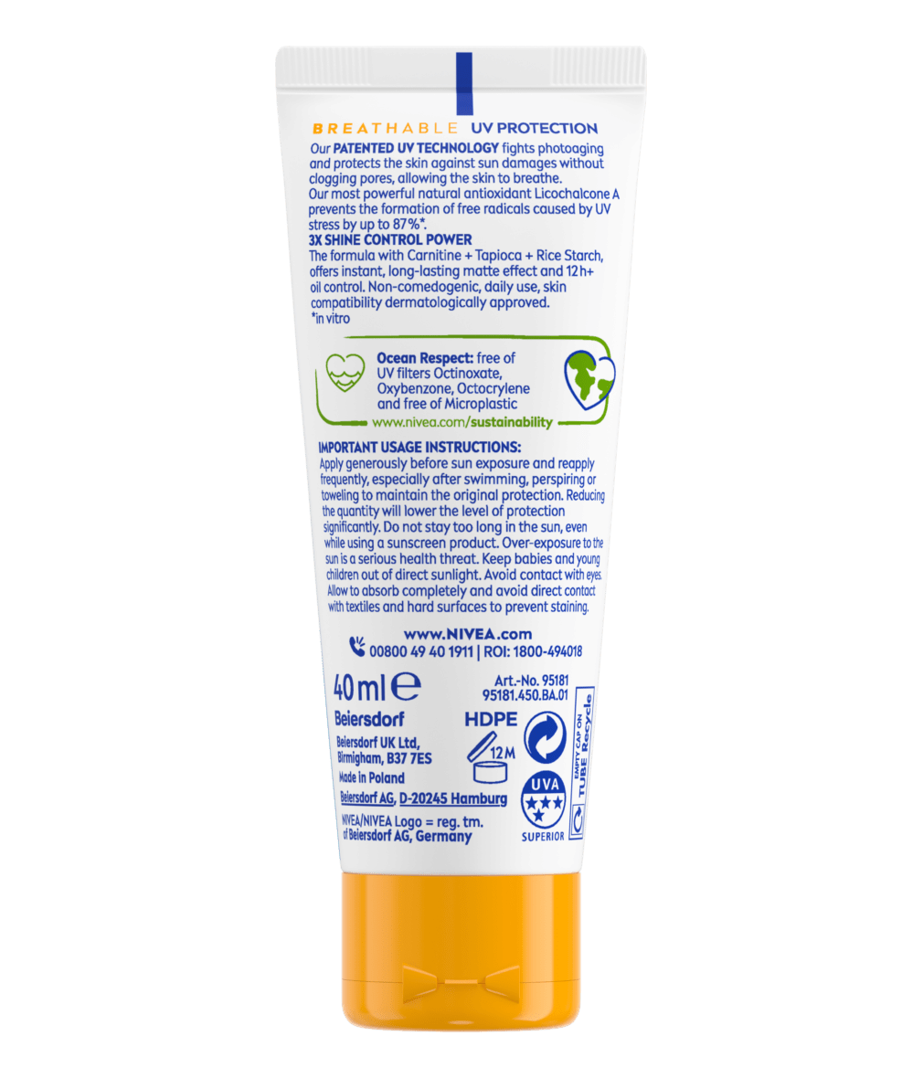 NIVEA SUN Breathable UV Face Shine Control SPF 50+ fights photoaging without clogging pores. Oil control for 12h+ and reduces pore visibility.