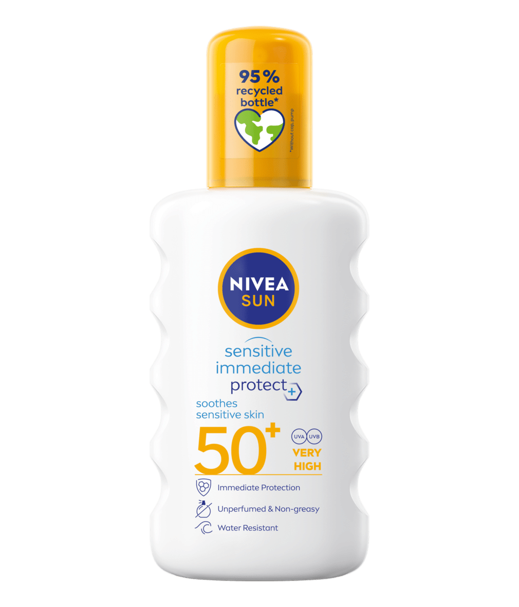 Immediately protects & soothes sensitive skin with Aloe Vera: NIVEA SUN Sensitive Immediate Protect Pump Spray Soothing