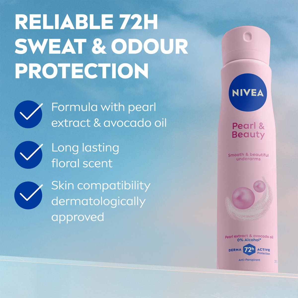 NIVEA PEARL & BEAUTY Anti-Perspirant beautifies your underarms with natural pearl extracts to even out skin tone and enriched with Avocado Oil for soft, smooth, and beautiful underarms. Reliable 72h anti-perspirant protection that cares for your skin.