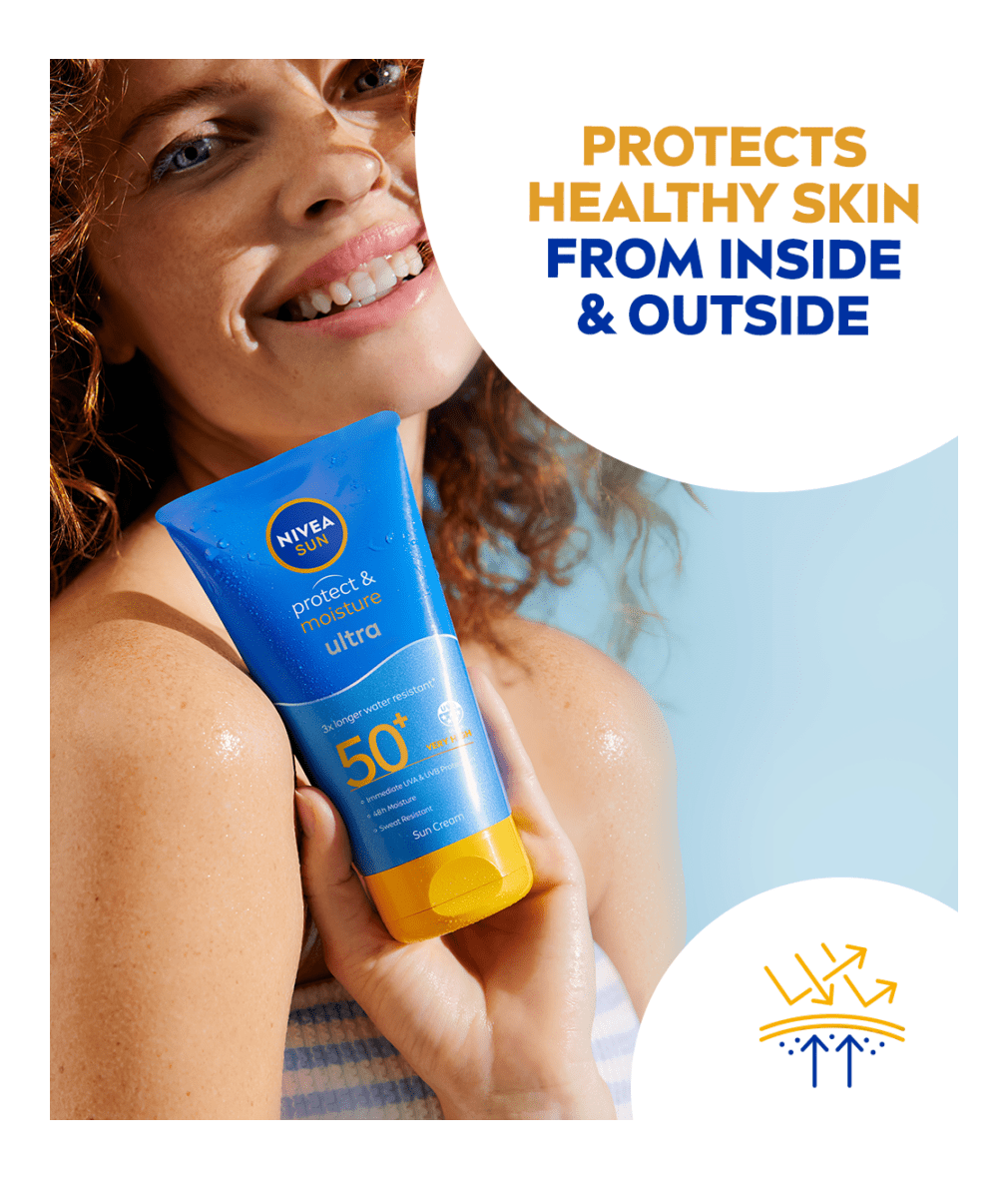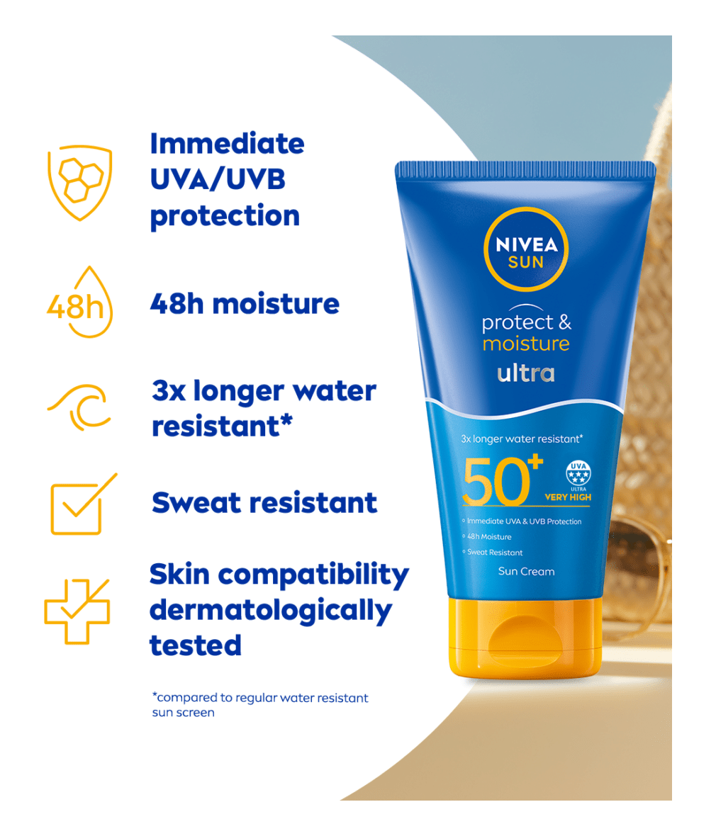 Immediate and long-lasting UV protection with 3x longer water resistance compared to regular water resistant sunscreen: NIVEA SUN Protect & Moisture Ultra Sun Cream