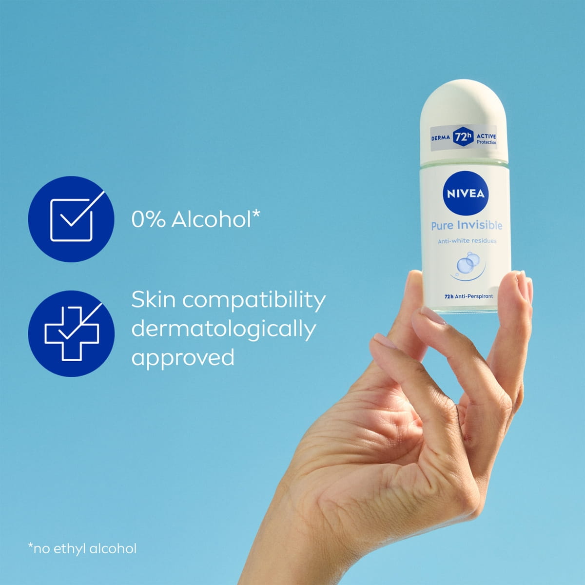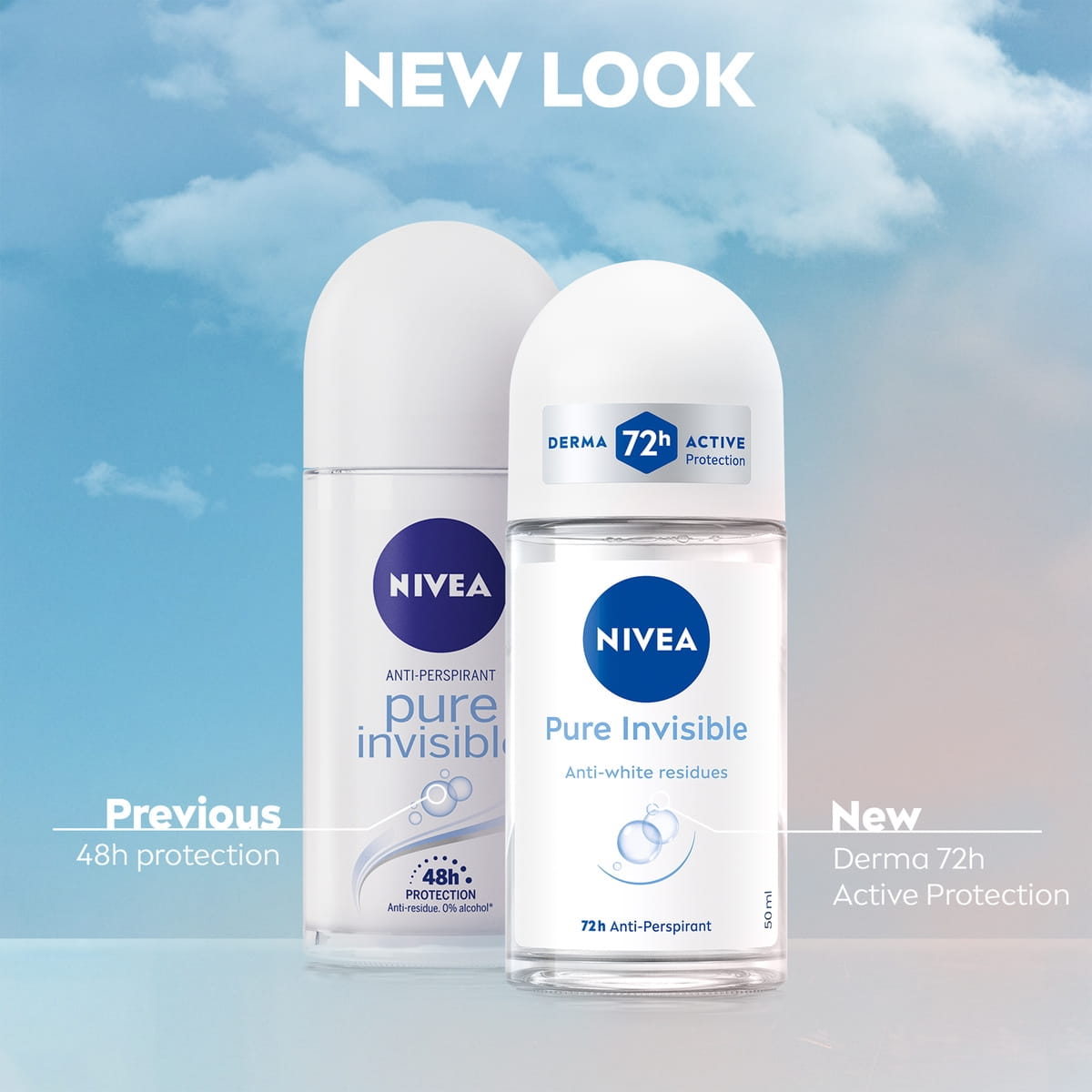 NIVEA Pure Invisible Anti-Perspirant. Anti-white residues protection for skin and clothes with no ethyl alcoh. 72h reliable anti-perspirant protection that cares for your skin.